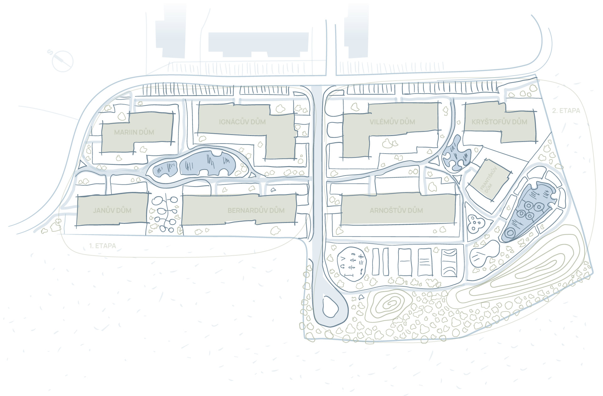 K příjemné atmosféře areálu várazně přispívá i dvojice jezírek, které zároveň pomáhají efektině zadržovat dešťovou vodu.